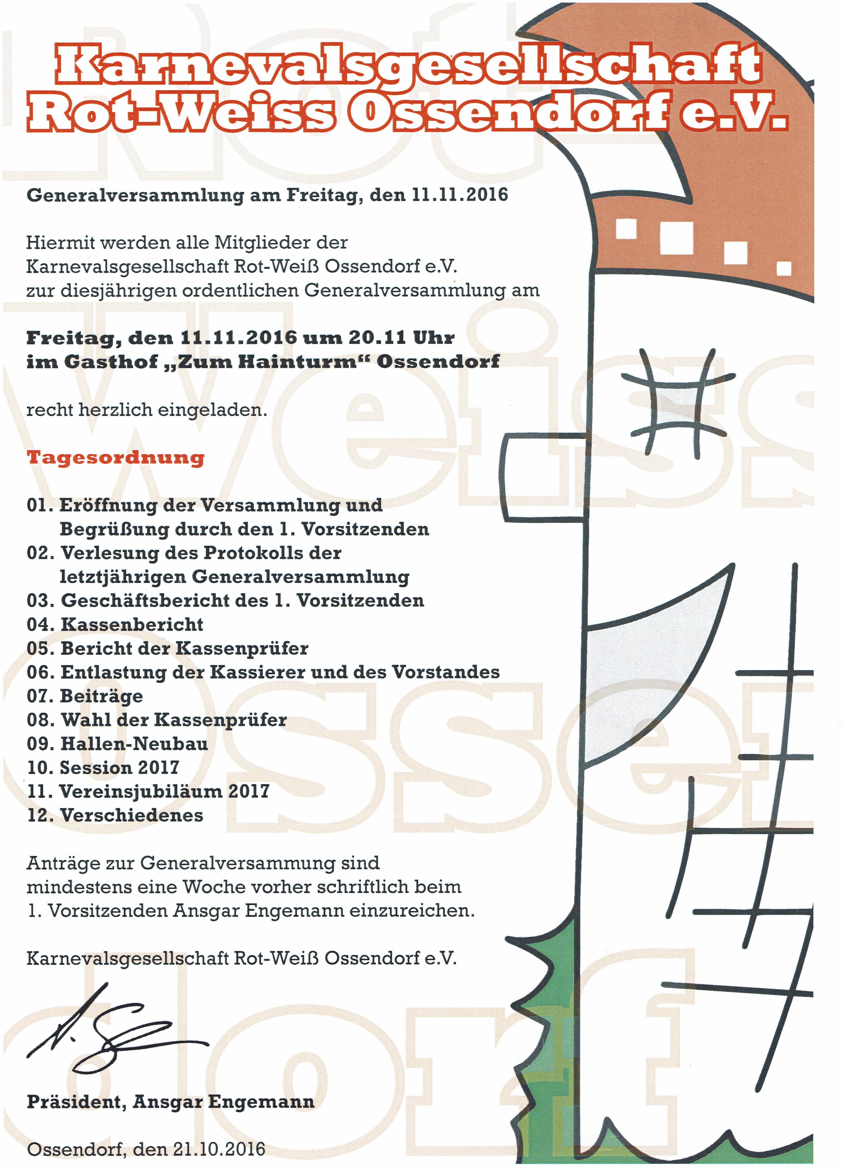 Einladung zur Generalversammlung der Karnevalsgesellschaft am 11.11.2016