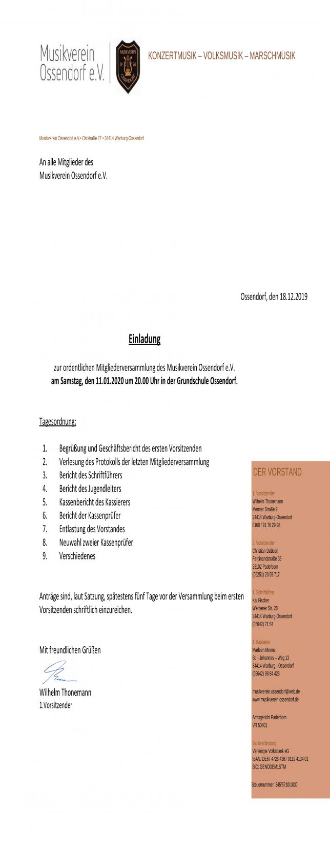 Generalversammlung des Musikvereins Ossendorf am 11.01.2020
