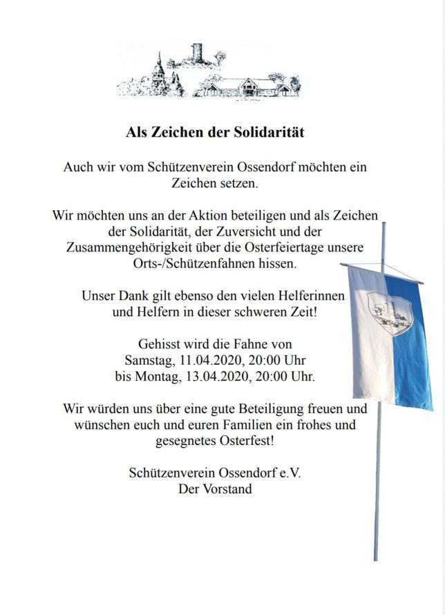 AktuellesWir machen mit – Fahne zeigen für Solidarität 8. April 2020 /Der Ossendorfer Schützenverein beteiligt sich an einer Aktion, die über die Osterfeiertage die Solidarität unserer Dorfgemeinschaft in dieser schwierigen Zeit zeigen soll.